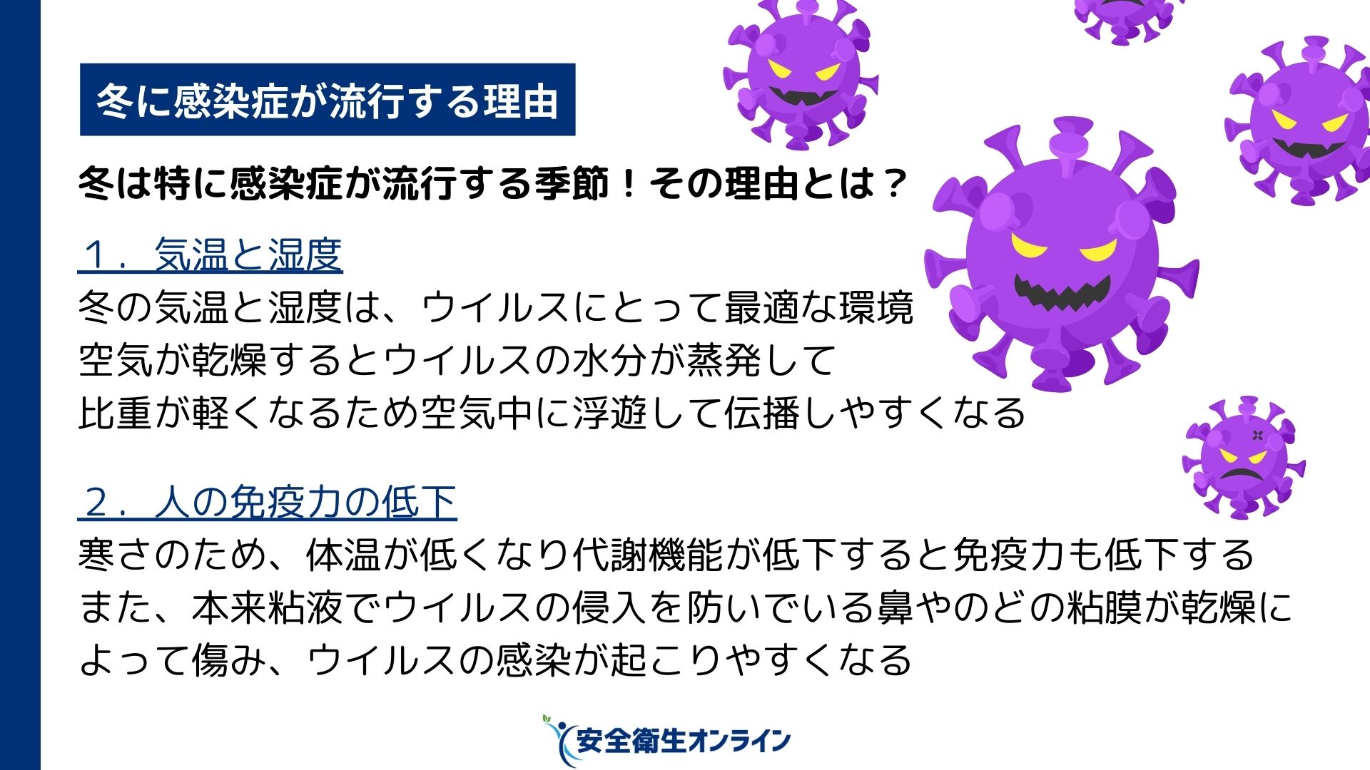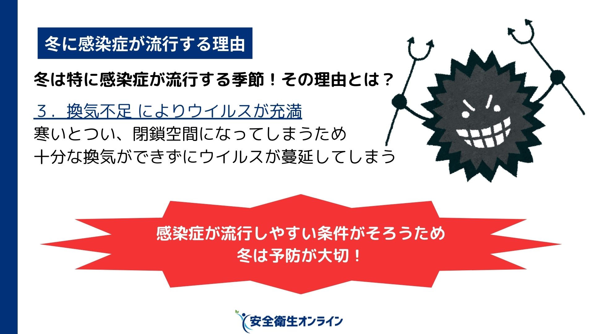 【無料】12月の衛生委員会、オススメのテーマ 衛生委員会 2025.11.22 目次 12月の衛生委員会テーマ1「インフルエンザ、ノロ…冬の感染症」12月の衛生委員会テーマ2「脳卒中と心筋梗塞」 12月の衛生委員会テーマ1「インフルエンザ、ノロ…冬の感染症」 資料の無料ダウンロードはこちら→冬に流行する感染症 – 会社と個人でできる予防策 – 12月の衛生委員会テーマ2「脳卒中と心筋梗塞」 資料の無料ダウンロードはこちら→脳卒中と心筋梗塞